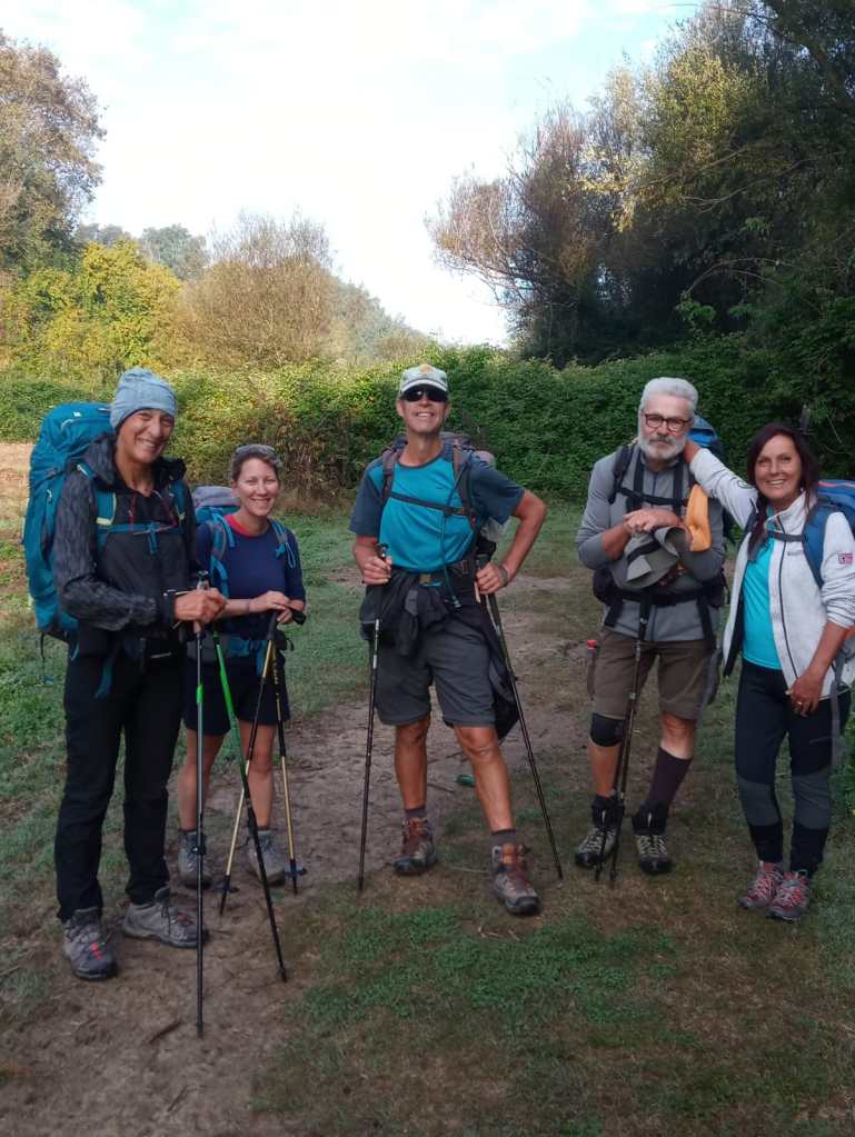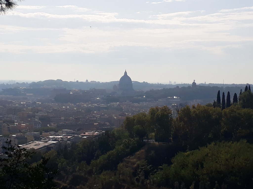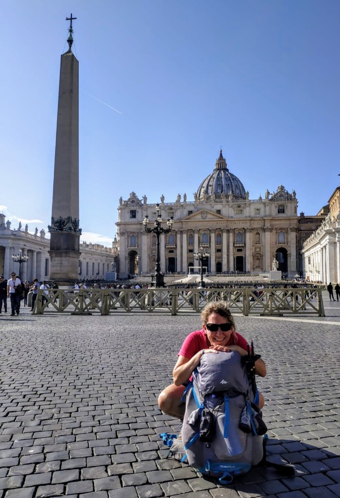Et voilà, le grand jour est arrivé: 56ème et dernière journée de cette incroyable aventure. Dans quelques heures, si tout va bien, que je ne me fais pas attaquer par un chien, que je ne fais pas une mauvaise chute si près du but, je serai à Rome. Roma, città eterna, Roma où j’ai vécu plusieurs mois il y a 20 ans, Roma et l’accent romain que j’adore, le Trastevere, le Campo dei Fiori… Pour bien commencer, l’univers m’offre encore un de ces levers du soleil splendide que je découvre à peine réveillée, depuis la fenêtre de la chambre. Lucia, Pascal, Roberto et moi nous mettons rapidement en route et retrouvons Lidia et Maria au bar (l’être humain est définitivement une créature à habitudes, elles s’immiscent même dans des périples où tout change sans cesse) et continuons tous les six. Alors que plusieurs fois on m’a avertie que la dernière étape était pénible et même conseillé de la zapper et d’arriver en bus ou en train, j’ai la bonne surprise de voir que vite on quitte le bord de route pour une réserve naturelle. Nous sommes à quelques kilomètres du centre de Rome et pourtant il me semble que je suis en pleine jungle. Nous traversons cet espace préservé et arrivons dans un quartier quelconque de Rome. Cette fois, c’est vraiment la ville. On est samedi matin et l’animation bat son plein: qui fait les courses, qui est au café, promène le chien, attend le bus… À peine le temps d’observer cette effervescence qu’on entre dans le parc de Monte Mario, que je ne connaissais pas mais qui offre une très belle vue sur Rome, et notamment sur la coupole de Saint Pierre de Rome, notre objectif. Nous nous arrêtons pour l’admirer, et aussi un peu par émotion d’être là, d’être à Rome ! Mais nous ne sommes pas pressés d’arriver au point final, cela se sent, nous prolongeons d’ailleurs l’étape en nous arrêtant à un bar pour grignoter quelque chose, alors que nous ne sommes qu’à deux kilomètres à tout casser de Piazza San Pietro. Régénérés, nous abordons la fin au milieu d’une foule impressionnante de touristes. Et voilà : la place s’ouvre devant nous, on y est ! Une grande joie et une grand émotion, que je ne parviens pas à décortiquer, et d’ailleurs je n’en ai pas envie. Après les félicitations, après les photos, nous passons récupérer nos testimoniums, un genre de certificat en latin. Puis c’est ostello, apéro, resto. Le temps du bilan, de l’intégration de cette expérience viendra, mais aujourd’hui c’est la célébration: je suis arrivée à Roma !
