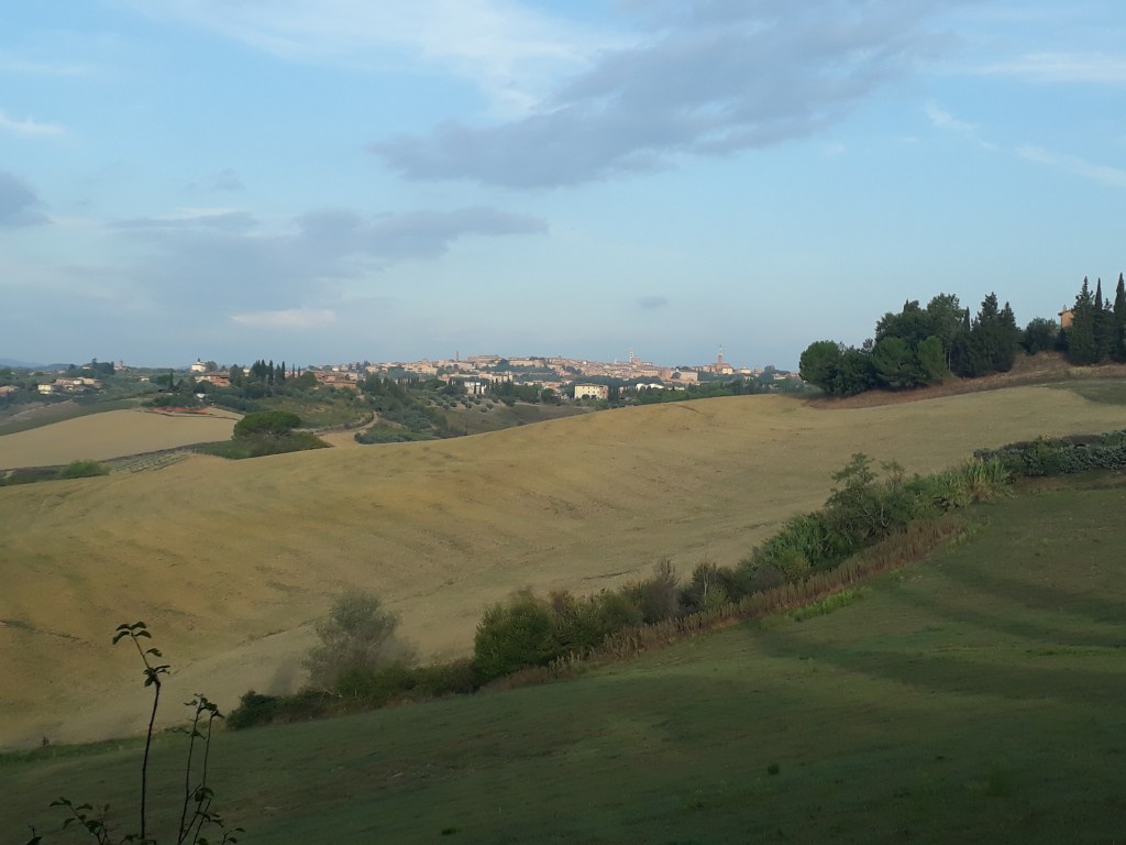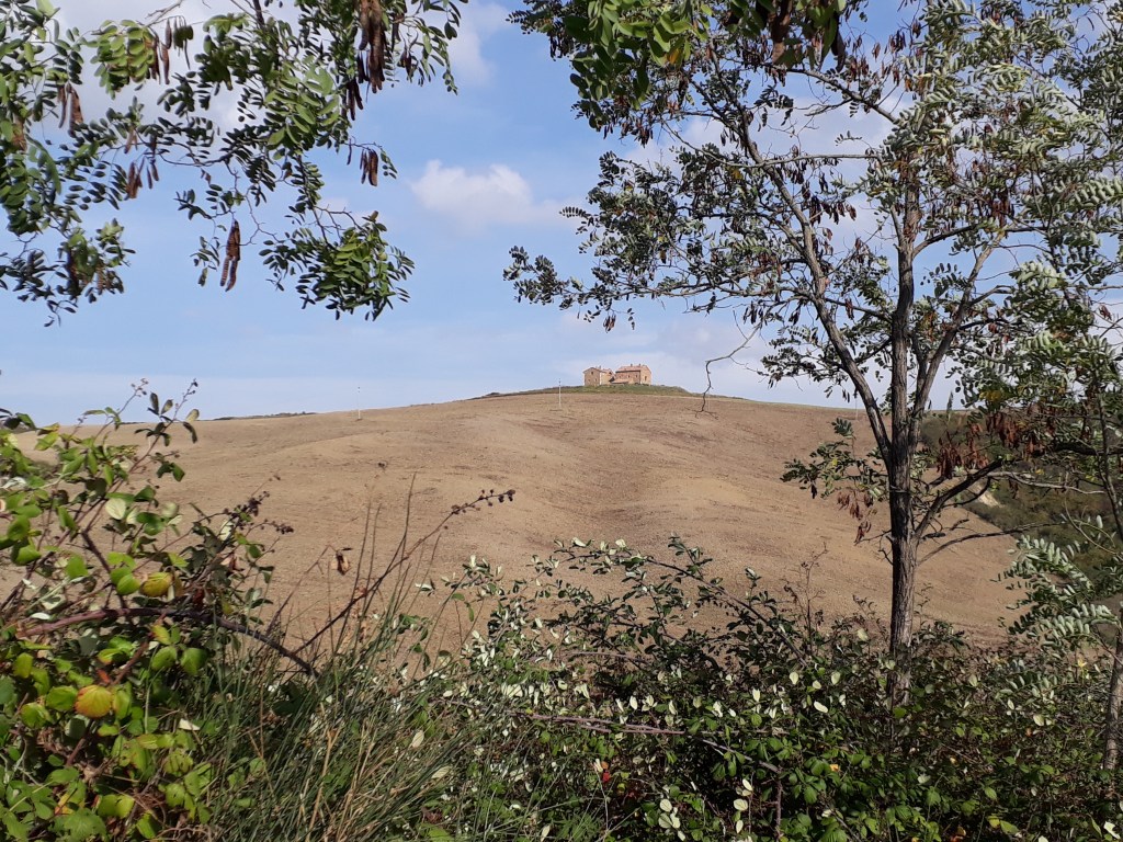 Je quitte Sienne de bon matin et la vois s’éloigner du coin de l’oeil en parcourant la campagne alentours. En chemin, je rencontre des « petits nouveaux »: Chris, de Chicago, et Charlotte, hollandaise, qui sont chacun partis de Sienne pour aller jusqu’à Rome. Eux aussi marchent plus vite que moi, ils ne tardent donc pas à me distancer, d’autant plus que je ne peux m’empêcher de m’arrêter sans cesse pour admirer collines, vallons, cyprès, dégradés de jaune et de vert qui me laissent rêveuse. Dans l’après-midi, je traverse un champ de tournesols qui me plonge dans une réflexion sur la vie, sur l’espoir et sur le fait d’oser être soi: tous les grands tournesols baissent la tête, c’est l’automne, ils sont brulés et ne regardent plus vers le soleil, ils lui tournent même le dos, semblant résignés. Mais ici et là, de tout jeunes tournesols pétillants d’un jaune bien vivace leur font face effrontément, ils profitent du soleil, ils resplendissent. L’image me plait et m’inspire ! Je sors de mes pensées en voyant arriver un autre randonneur: Christian, franco-suisse, qui va aussi jusqu’à Rome. Nous discutons quelques instants puis il part devant. J’arrive à Ponte d’Arbia, minuscule village qui est mon étape de ce soir, et m’installe dans l’énorme ostello où je suis seule ce soir. Je suis un peu déçue car je suis d’humeur sociable aujourd’hui, mais je prends ce qui vient… Au moment de cuisiner mon dîner, je me révèle incapable d’allumer la gazinière de cuisine professionnelle mise à ma disposition. Je me résous donc à aller au resto d’en face qui propose un menu du pellegrino. En entrant, je tombe sur Anna et Manuela qui m’invitent à leur table. Nous sommes vite rejointes par Christian. Je passe donc un très joyeux moment avec eux, mon humeur sociable peut se rassasier d’éclats de rire, d’anecdotes et de partage ! La vie réserve chaque jour de nombreuses petites surprises et je compte bien profiter de chacune d’elles.