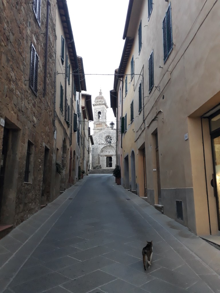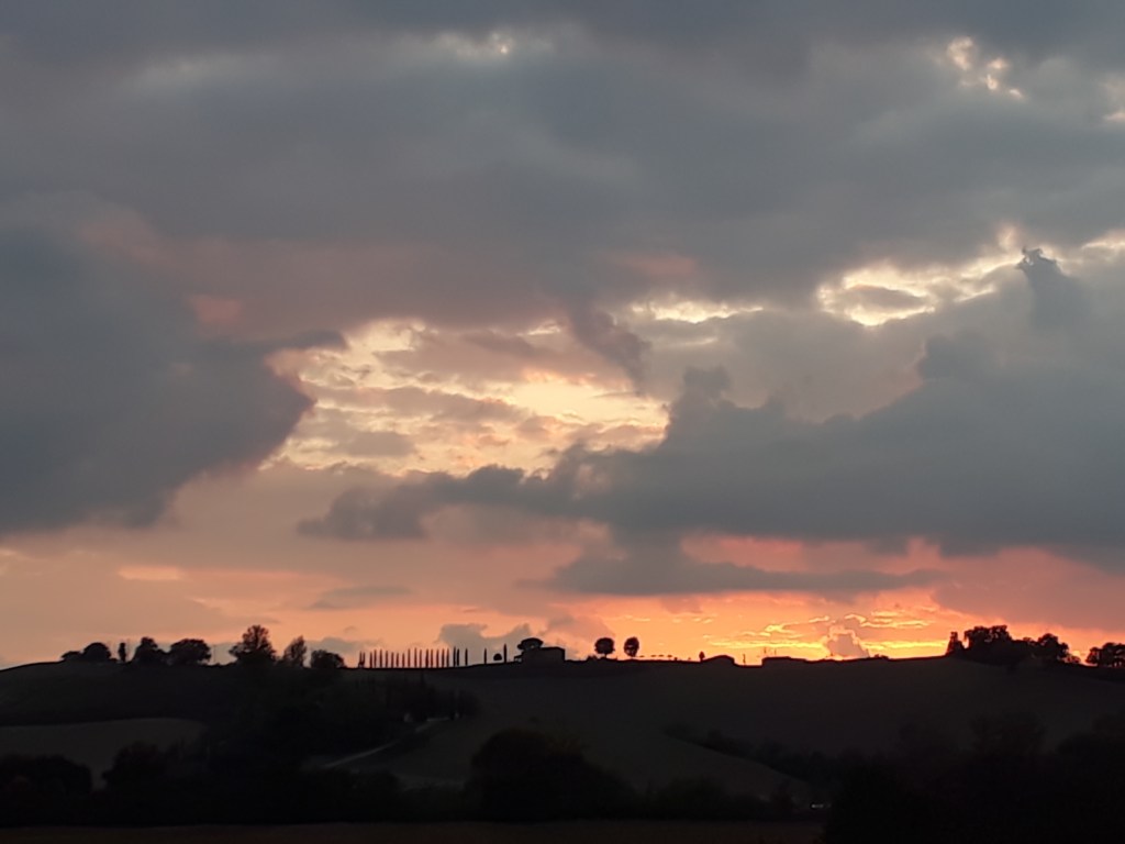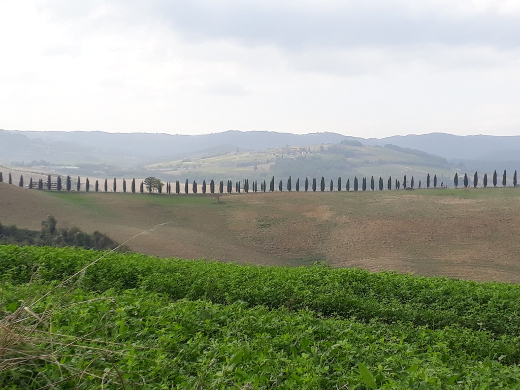 Bref, une fois le brouillard quelque peu dissipé, je rencontre Karina et Max, mère et fils suédois qui marchent depuis Canterbury en plusieurs petits bouts. Nous passerons toute la journée à nous croiser dans la joie et la bonne humeur. Nous passons cependant un peu plus de temps lors d’une pause dans une (délicieuse) pâtisserie de Torrenieri, et c’est l’occasion pour Karina de me faire part d’une réflexion qui attire toute mon attention: elle sent qu’en marchant son corps et son mental s’alignent, elle se sent plus unifiée au fur et à mesure du chemin. Je ne peux qu’approuver, même si mes tergiversations mentales sur mon avenir n’ont pas cessé en marchant. La différence est peut-être que j’arrive plus facilement à les accepter et à m’en détacher pour vivre pleinement le présent. En reprenant ma marche, je réalise aussi à quel point mon corps soutient ce projet un peu fou depuis le début. Il ne m’a pas lâché pour le moment: oui j’ai parfois mal aux pieds, oui mes cuisses brûlent souvent, oui j’ai l’impression d’être rouillée quand je me lève après être restée assise plus de trois minutes. Mais ce corps, si petit et imparfait soit-il, soutient mon mental quand celui-ci flanche et n’a plus envie d’avancer. Je le remercie à haute voix tout en continuant mon périple. J’arrive dans le village perché de San Quirico d’Orcia et ai un vrai coup de coeur pour ses ruelles, ses jardins, ses petites places… Je retrouve Anna, Manuela et Christian et nous passons une excellente soirée (un peu gargantuesque c’est vrai, mais marcher ça creuse, je l’ai déjà dit) à déguster un menu du pellegrino. En me couchant, je repense à ma discussion avec Karina. Telle que je la vis, son équation est incomplète si l’on ne rajoute pas un troisième larron au binôme mental / corps: le coeur, les émotions. Personnellement, je me sens alignée lorsque mes pensées, mon corps et mon coeur sont en harmonie. Autant dire qu’il s’agit là de moments précieux (comme lorsque j’observe avec émotion un champ de tournesols) !