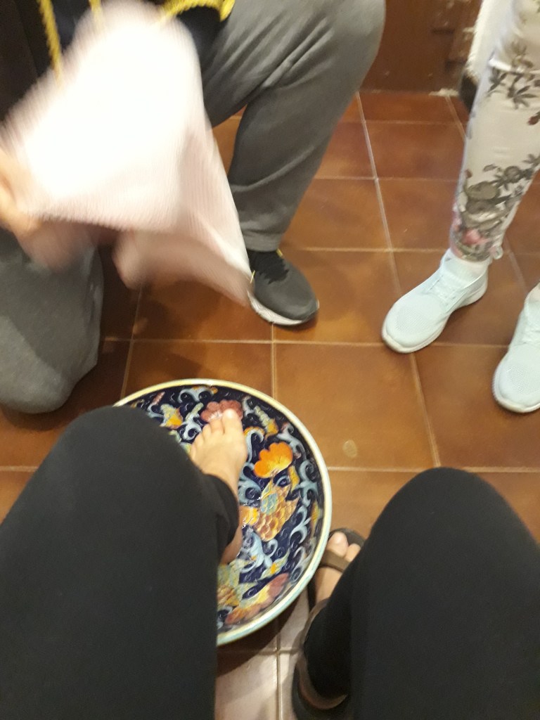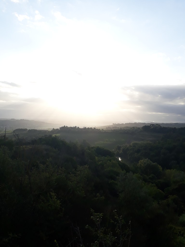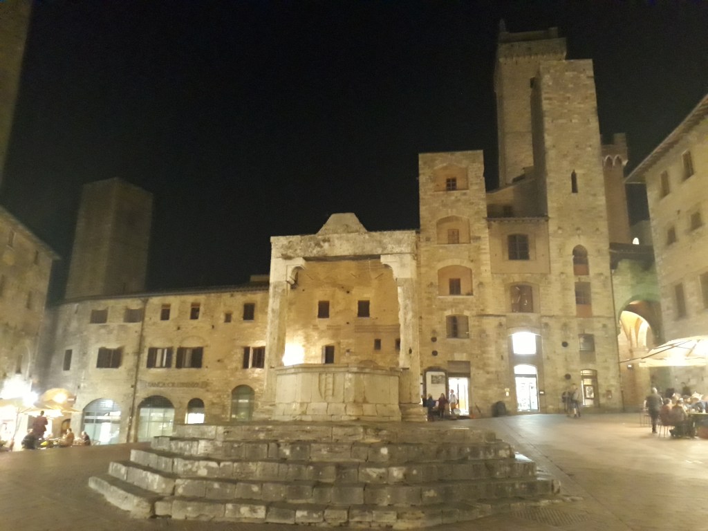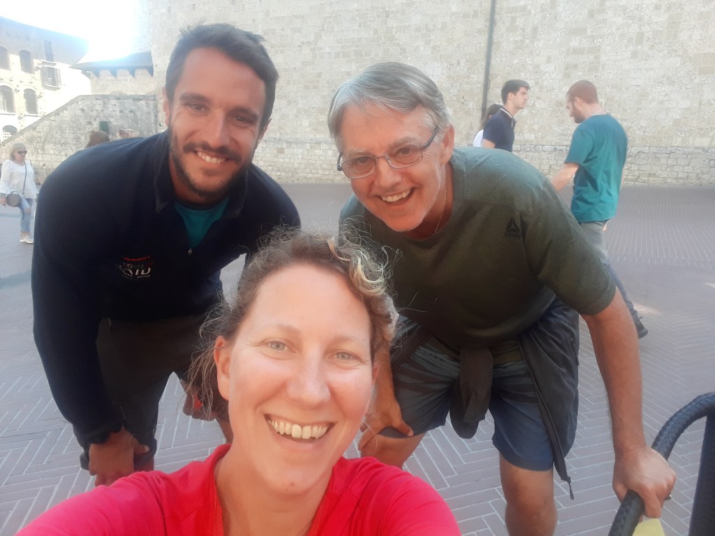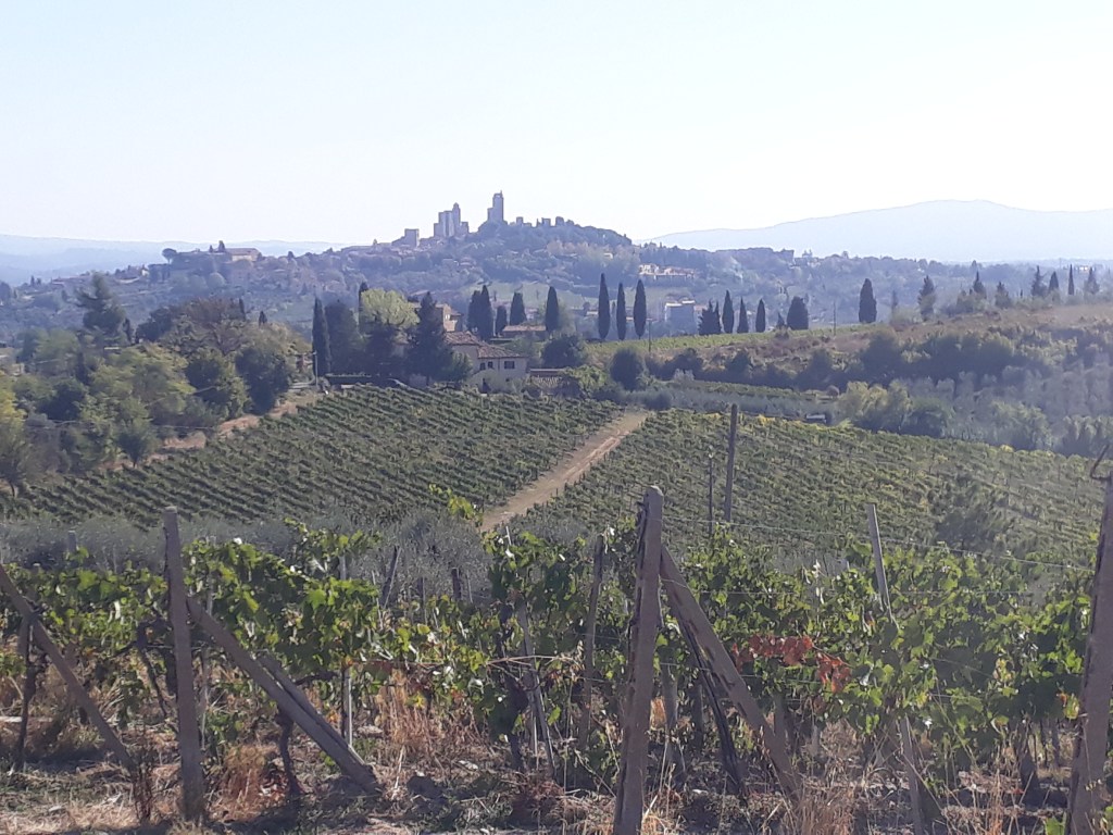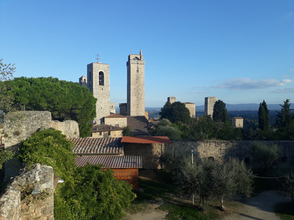 Le matin suivant, après un solide petit-déjeuner et un lever de soleil en prime, je pars avec Pierre. En chemin, il me montre comment il utilise son drone, qui lui permet de faire des films magnifiques sur son voyage. Nous rencontrons l’autre Pierre en chemin et marchons un moment tous les trois dans la joie et la bonne humeur. Cela ne dure pas car ils vont trop vite pour mes petites jambes, surtout dans les montées, qui ne manquent pas en terre toscane. Je les laisse donc partir devant et continue en m’arrêtant toutes les deux minutes, tant je suis émerveillée par ce qui m’entoure. Je les retrouve pour une bière bien méritée en arrivant à San Gimignano, merveille médiévale saturée de touristes américains. J’ai comme l’impression d’être à Disneyland. Je pars m’installer à l’Ostello où m’attendent les deux volontaires présents pour la semaine, Marisa et Oliviero. Ils m’annoncent qu’avant le dîner aura lieu un cérémonie de lavage des pieds ! Me vient alors une légère angoisse: je sais qu’il s’agit là d’une tradition liée au pèlerinage, mais je ne sais pas trop à quoi m’attendre. Je décide d’appliquer ma philosophie actuelle: laisser venir ce qui vient et être ouverte à la nouveauté. Finalement cela s’avère surprenant mais intéressant, Oliviero mouille mon pied au dessus d’une bassine en céramique, le sèche, l’embrasse et ensuite ils recitent tous les deux une prière. Nous mangeons ensemble ensuite. Enfin, il est sans doute plus exact de dire qu’ils mangent et je me gave… Je pars ensuite retrouver Pia et Renata pour boire un verre sur une des places iconiques de San Gimignano, la piazza Cisterna. Je savoure un Montepulciano Nobile, que je qualifierais de tuerie absolue, en discutant à bâtons rompus en italien: je suis heureuse ! De plus, la ville respire une toute autre atmosphère car l’écrasante majorité des touristes sont partis, son charme me touche et je vais me coucher comblée par toutes ces rencontres et découvertes.