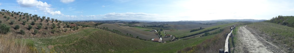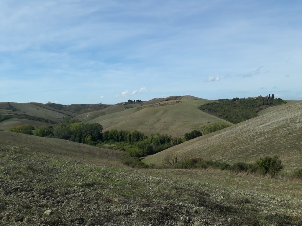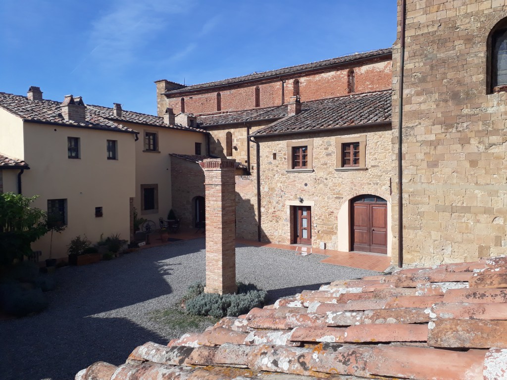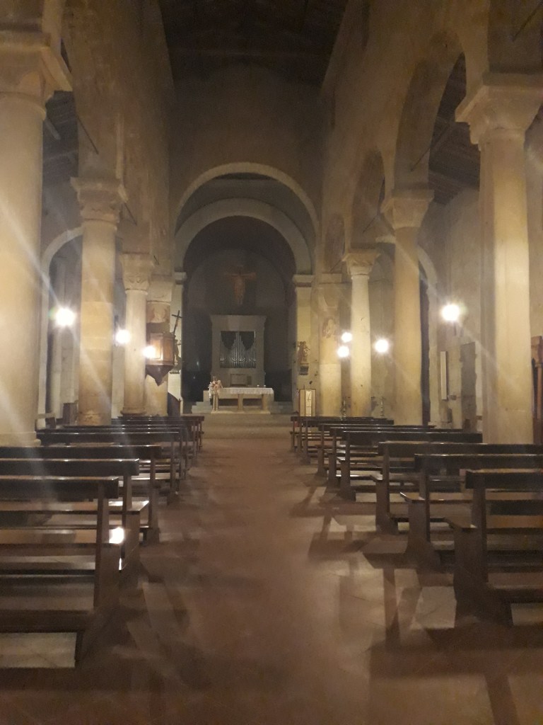 Les jours se suivent et ne se ressemblent pas. Je quitte San Miniato à l’aube pour admirer les couleurs, le ciel est quelque peu nuageux mais me laisse tout de même en apercevoir…Je traverse des paysages sublimes à perte de vue, me donnant presque la sensation de dominer le monde (ça doit être mon côté mégalo). Mais la force des éléments me ramène à ma petite place d’humaine: le vent se déchaîne sur ces hauts de colline, le soleil frappe fort… j’adore ! Moi qui n’ai croisé personne pendant deux jours, je rencontre aujourd’hui une foule de marcheurs: tout d’abord Pierre, un gai luron québécois, puis trois italiens. Je pense à tort que j’ai eu ma dose maximum pour la journée, vu la pénurie des jours précédents, mais en arrivant à l’ostello Sigerico, Antonella qui me reçoit m’apprend que ce soir nous sommes huit. Bonheur, joie, exultation ! Et en effet, une famille éphémère se constitue: il y a Pierre (le deuxième de la journée), jeune ingénieur toulousain entre deux boulots, Pia et Renata, retraitées milanaises dynamiques et volubiles, Antonio, force de la nature qui parcoure 50 kms par jour, Emiliano, (très beau) toscan qui profite d’un long weekend pour redécouvrir sa région à pied, et un couple de florentins dont les prénoms m’échappent. Nous nous attablons tous ensemble et passons un dîner fantastique à faire connaissance. Cerise sur le gâteau : en fin de repas, Antonella nous ouvre la porte de l’église du 11ème siècle adjacente à l’Ostello (le plus beau jusqu’ici) pour une visite privée. Deuxième cerise sur le gâteau : aucun ronflement dans la nuit alors que je partage ma chambre avec trois robustes hommes ayant bien arrosé leur repas ! Quelle journée !