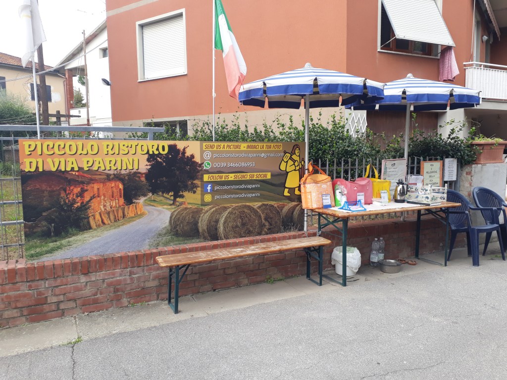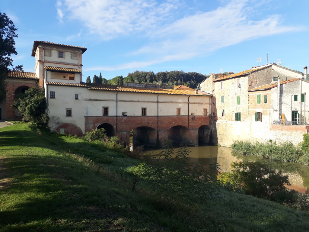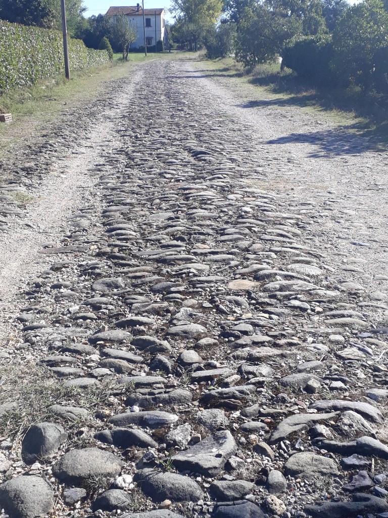 Sortir d’une grande ville à pied est toujours long et quelque peu périlleux, et quitter Lucca n’échappe pas à la règle. Je marche le long de routes assez fréquentées et traverse des banlieues résidentielles sympathiques mais banales. Puis la Via emprunte des chemins forestiers plus agréables, jusqu’à arriver dans la jolie ville d’Altopascio. J’y fais un passage à la bibliothèque municipale pour rendre un service à mes amis écossais Andy et Michelle, plus revus depuis longtemps mais avec lesquels je suis toujours en contact. Ma mission consiste à récupérer pour eux, sur papier libre, un tampon qui est, semble-t-il, mythique et important historiquement. Je l’accomplie avec joie. J’emprunte ensuite une voie romaine quasi intacte pour arriver à Galleno. Je suis impressionnée et me sens un petit maillon de la grande histoire de l’humanité (rien que ça) ! Je suis accueillie à l’ostello par Gabriella, concentré de chaleur et de bonne humeur. J’apprends que ce soir je suis la seule pèlerine. Passée une légère déception, je passe une très bonne soirée en compagnie de moi-même, autour d’un délicieux plat de spaghetti que je prépare en mon propre honneur et que je déguste en écoutant de la musique.