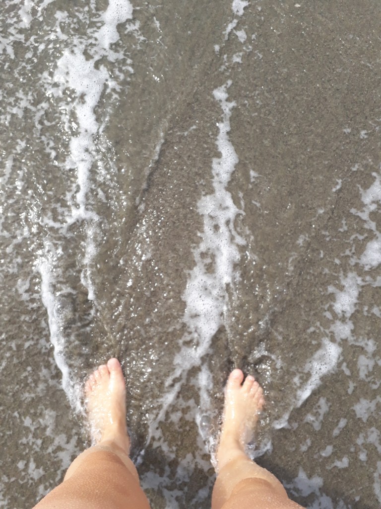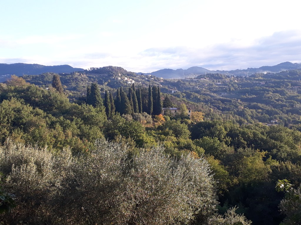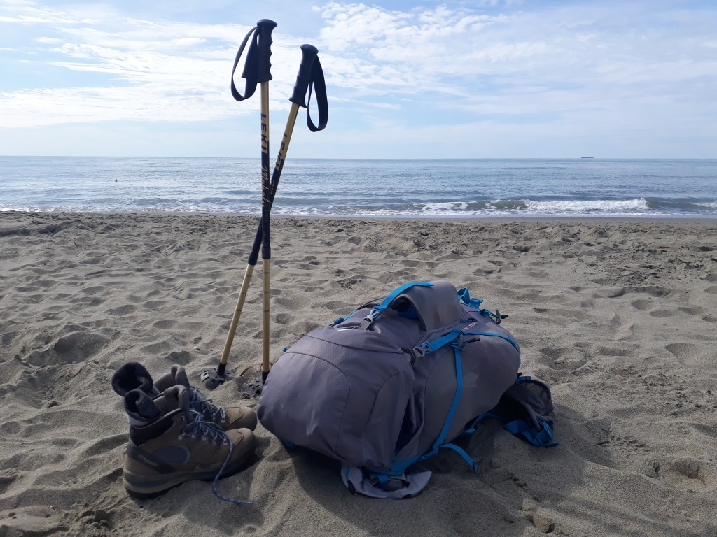 Pas de départ à l’aube pour moi ce matin, j’ai apprécié l’expérience mais souhaite aussi prendre mon temps, je marche donc seule. Il est tout de même tôt quand je pars, la douceur des lumières qui caressent Sarzana quand je la quitte en témoigne. Quelques villages et champs d’oliviers plus loin, je fais une infidélité à la Via Francigena et m’en écarte : hors de question pour moi de passer si près de la grande bleue sans aller la saluer: je file à Marina di Sarzana. En entrant sur la plage: qui vois-je apparaître ? Mes amis russes Inna et Viktor ! Incroyable, partout où je vais je les vois, même en dehors du chemin ! Nous sommes tous les trois ravis de cette surprise et nous saluons chaleureusement. La plage est presque déserte en ce début octobre, et je suis là seule à me baigner. Habituée à l’eau normande, la température me convient parfaitement et je me délecte de ce moment de répit, mes pieds aussi !