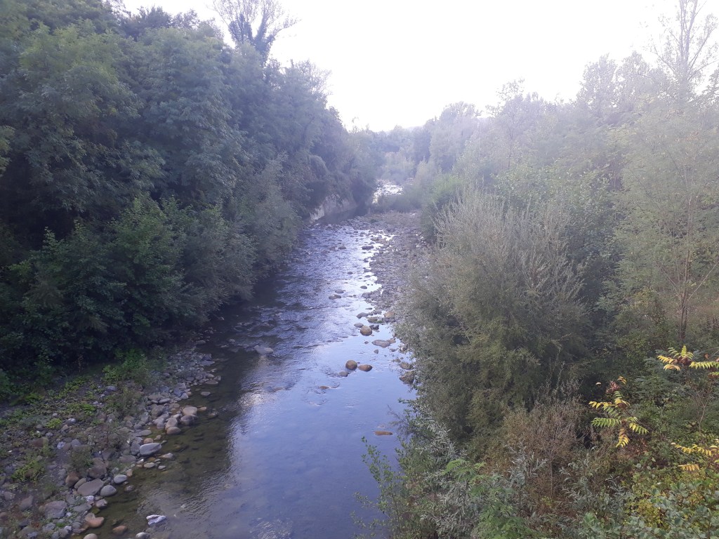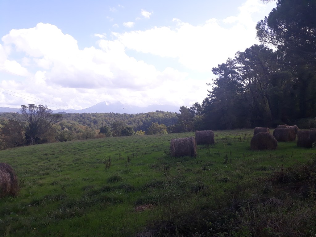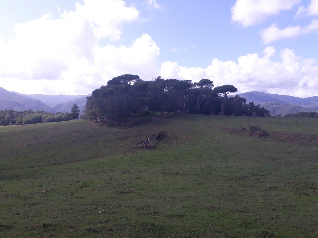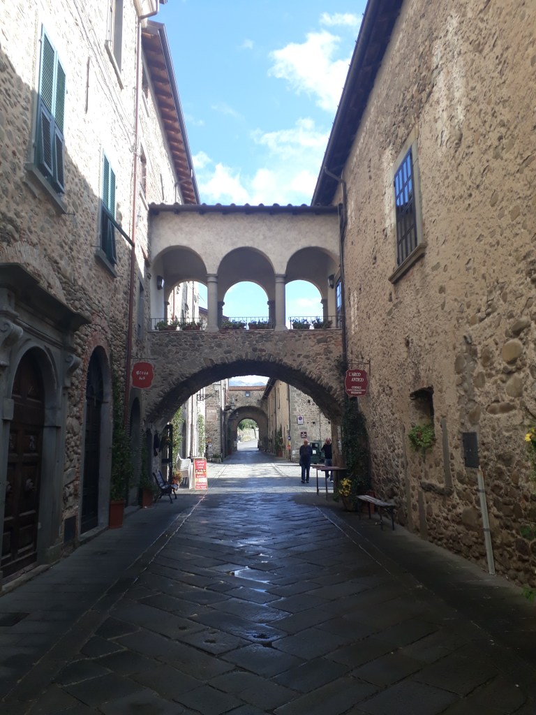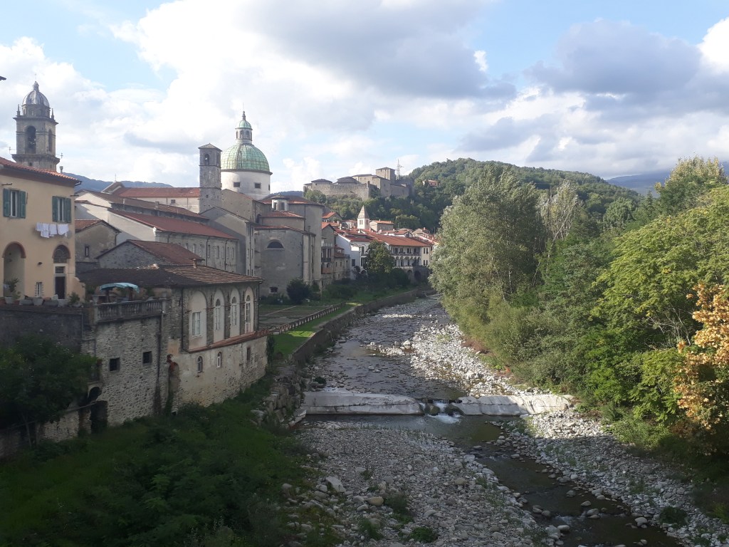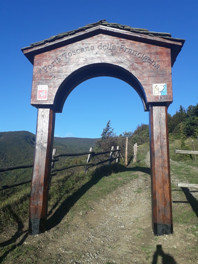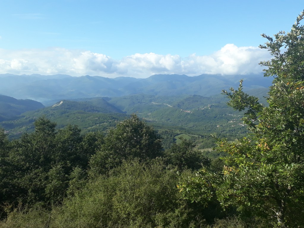 Je quitte l’Ostello du Passo della Cisa mal réveillée, et un peu fatiguée, mais rapidement l’arrivée en Toscane me dynamise et m’émerveille. Je traverse une forêt de pins centenaires baignée d’une lumière douce qui semble m’envelopper. J’admire les montagnes qui se détachent les unes des autres, telles des ombres chinoises. Après un col offrant une vue à 360°, je descends dans un village et suis violemment ramenée à ma peur des chiens par trois roquets (je ne vois pas d’autre mot employer) en liberté qui se mettent à aboyer en me voyant apparaître à l’autre bout de la rue. Mon sang ne fait qu’un tour et mes vieux réflexes reprennent le dessus : je fais demi-tour ! Lorsque je suis assez loin pour qu’ils cessent, je retrouve ma raison. « Sabine, tu ne peux pas rester bloquée ou faire demi-tour…que faire ? » Vite, vite, soyons créative…j’ai cru entendre de la musique dans la première maison du village, alors je tente le tout pour le tout: je sonne chez eux. Une dame sort: « Désolée de vous déranger, mais il y a des chiens là-bas qui ne me laissent pas passer (ce n’est pas tout à fait vrai car je n’ai même pas essayé). Pouvez-vous m’aider ? » Et la dame gentiment m’accompagne dans le village et fait fuire les chiens. Un peu honteuse mais très reconnaissante, je poursuis ma route pendant encore de nombreuses heures avant d’arriver à Pontremoli et d’y retrouver Marco à l’ostello de San Lorenzo Martire, un ancien couvent transformé en accueil pour pellegrini. Nous mangeons un délicieux « menu du pèlerin » à prix dérisoire en compagnie de Myriam, qui est arrivée à sa destination finale.