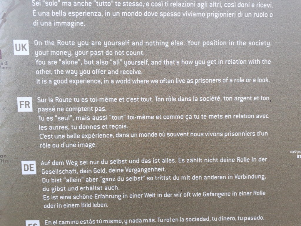 Aujourd’hui 30 septembre: un mois de marche… j’apprécie l’expérience au delà de ce que j’avais espéré. Ce qui me plaît le plus, et que je retrouve justement à travers des messages disposés ici et là au cours de cette étape, c’est le retour à l’essentiel, à l’essence de qui l’on est tout au fond de nous. La catégorie sociale, l’âge, le statut matrimonial, la profession, tout cela ne compte pas en chemin. Chacun se dépouille de ses rôles, de ses identifications pour être seulement un humain qui rencontre et reconnaît d’autres humains, des animaux, la terre… Je trouve cela d’une beauté précieuse et tellement rare!