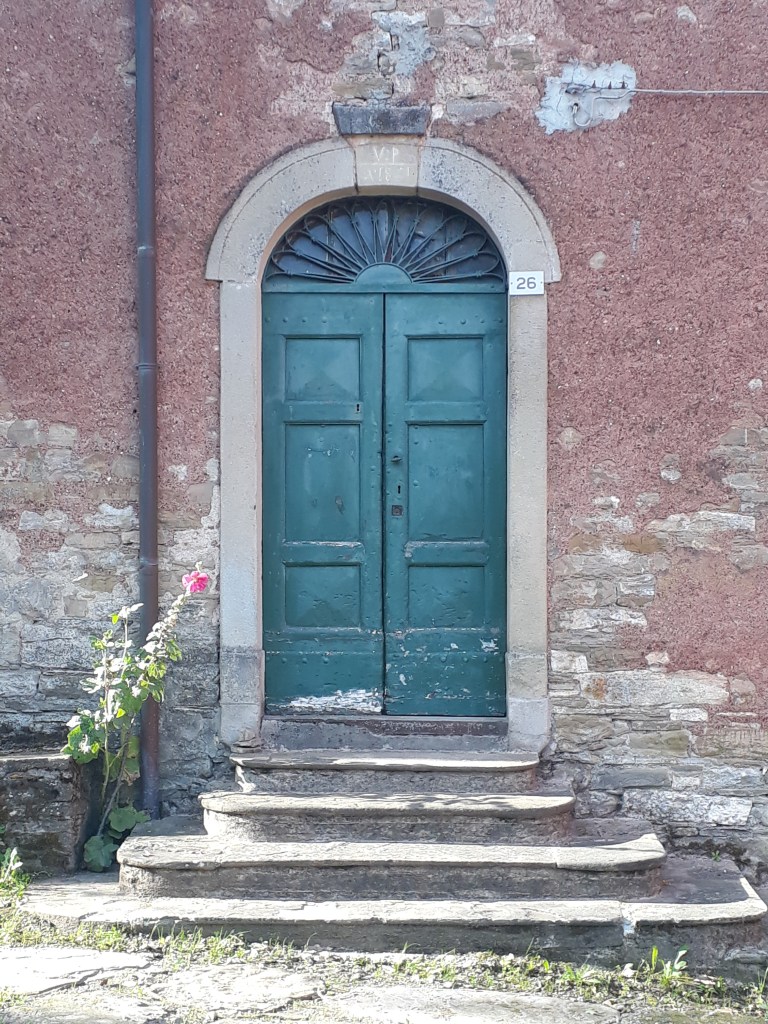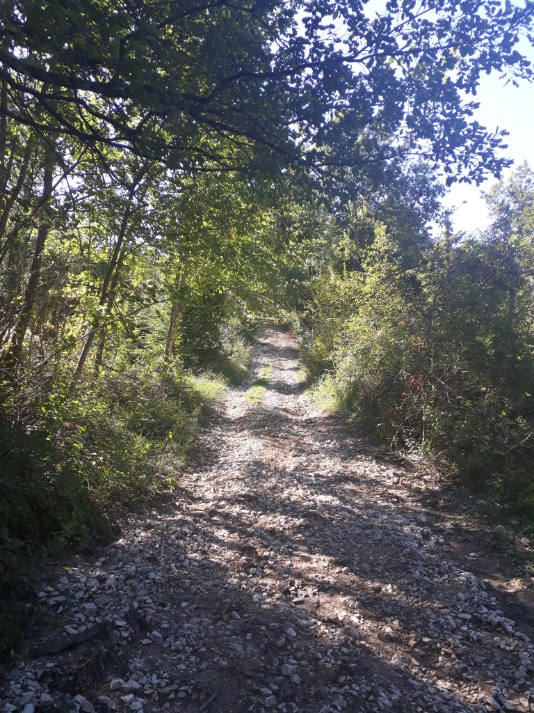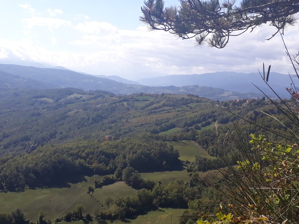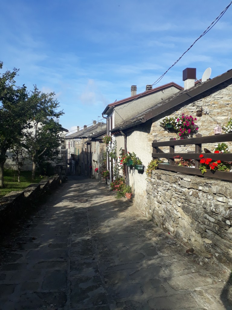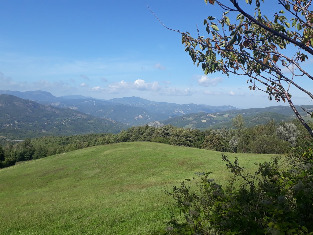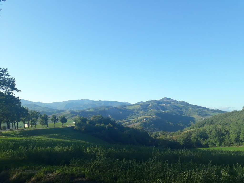Comme tous les jours, je pars après tous les autres, tranquillement. De toute façon, je sais que ce sera challengeant (vocabulaire de la start-up nation, une fois n’est pas coutume) physiquement et que je mettrai du temps à parcourir les 19 kms qui m’attendent, presque tous en montée, alors à quoi bon se presser. Dès la sortie de Fornovo, je découvre un paysage enchanteur qui ne m’évoque qu’un mot: douceur. Il est encore tôt et les ombres des arbres s’étirent avec élégance sur les champs d’un vert à la touche britannique. Je monte, je monte, à travers forêts, villages, champs…On est dimanche et je rencontre beaucoup de monde: des cyclistes, un groupe d’amis de Rimini qui me pose une foule de questions sur mon voyage…Encore une fois, je goûte à l’hospitalité locale: un monsieur m’offre tout naturellement des figues de son jardin et m’indique une fontaine à quelques pas. J’atteins Cassio, petit village perdu en pleine chaîne des Appenins, et m’installe à l’Ostello. Celui-ci est tenu par Andrea qui y met tout son coeur…cela se sent. La décoration, bien que vintage, est réconfortante et chaleureuse. Il est généreux, accueillant…je suis impressionnée et touchée. Je retrouve Marco, Ann, Ralph et Myriam, une belge que j’ai croisée il y a quelques jours et qui s’intègre immédiatement à notre joyeux groupe. Nous partons manger au bar d’à côté. Nous sommes presque sur le départ quand débarquent Inna et Viktor, éclairés à la lampe frontale, qui tentent tant bien que mal de faire comprendre qu’ils cherchent un endroit où dormir. Ma tendance polyglotte se réveille et je ne suis pas peu fière de les aider à trouver une solution en quelques minutes. Je me couche satisfaite et dors incroyablement bien.