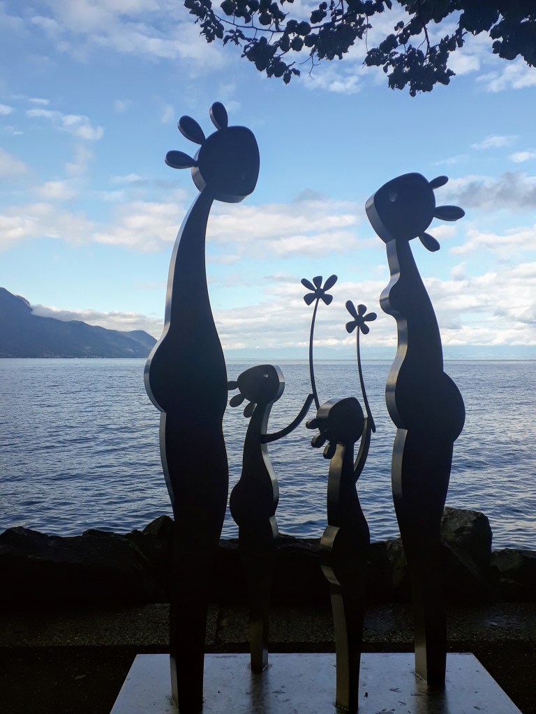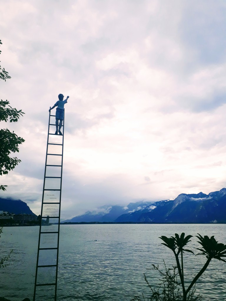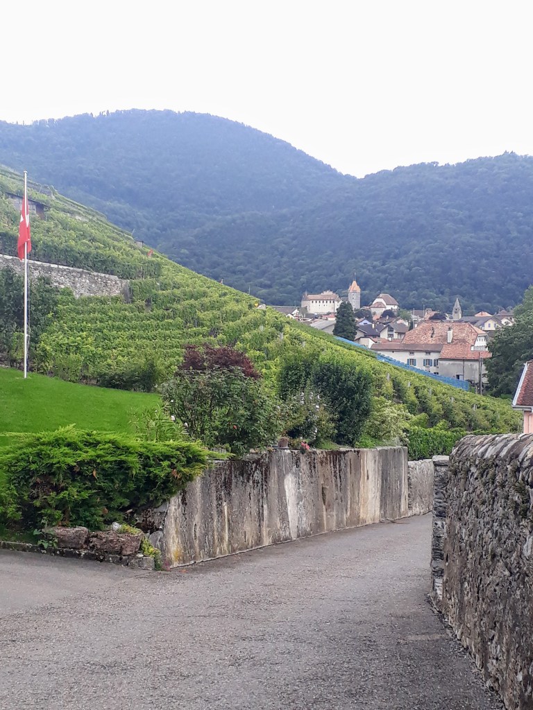 Le début de la marche est facile, je passe par Montreux, tout est beau, tout est opulent, des fleurs et des oeuvres d’art partout au bord du lac, des palaces et des villas à n’en plus finir, c’est donc ça la riviera suisse… Puis je dis au revoir au lac et je poursuis ma route. Mes pieds me font mal, et je passe par des chemins qui longent des usines de recyclage, des centrales électriques et d’autres merveilles architecturales d’une banalité affligeante, mais je regarde de l’autre côté et c’est la forêt, la montagne… alors, moi qui réfléchis très souvent en tout ou rien, toujours ou jamais, réussi ou raté, je comprends mieux ce qu’est la non dualité dont parlent la philosophie bouddhiste et les yogis: Le paysage n’est pas moche ou beau, il est moche et beau; j’ai mal aux pieds, aux jambes et au dos et je me sens immensément joyeuse quand même, la douleur n’empêche pas le bien-être. Sortir du tout ou rien est quelque chose que je tente depuis longtemps, cette marche m’y aide….Et le temps de penser à ça, me voilà de retour dans des paysages sublimes au milieu des vignobles!
